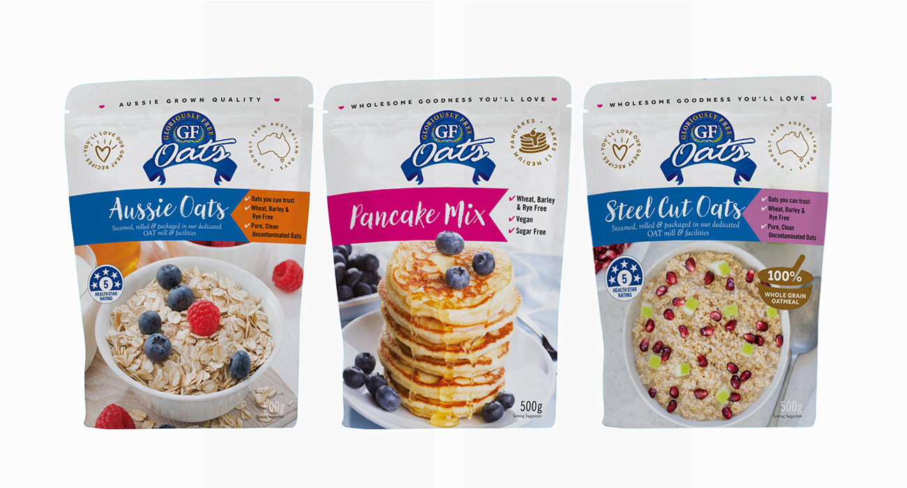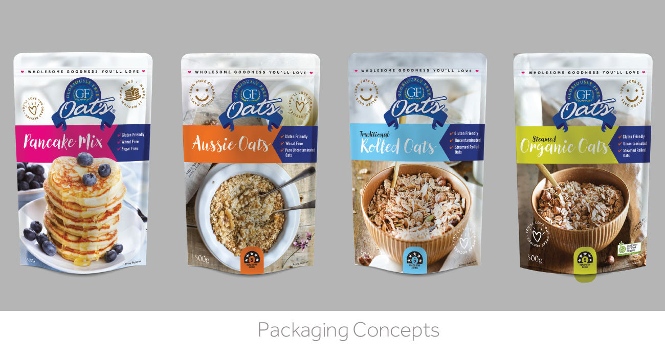We were approached by Kylie from GFO to rebrand and redesign all of the current packaging for their range of Gluten Free products. These are sold through various health food stores and online to their customers around Australia. The range consisted of biscuits, flour, muesli, pancake mix and oats. All available in different size packs and bulk